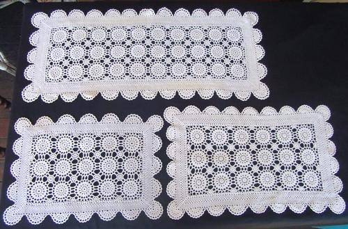 THESE THREE RUNNERS ARE ALL MATCHING IN DESIGN BUT WITH VERY SLIGHT DIFFERENCES IN COLOUR. THE TOP ONE IS A STUNNING RUNNER THAT COULD WORK VERY WELL ON A SIDE BOARD. CROTCHETING IS A DYING ARTFORM, AND THESE OLD TROUSEAU PIECES DESERVE TO BE LOOKED AFTER.