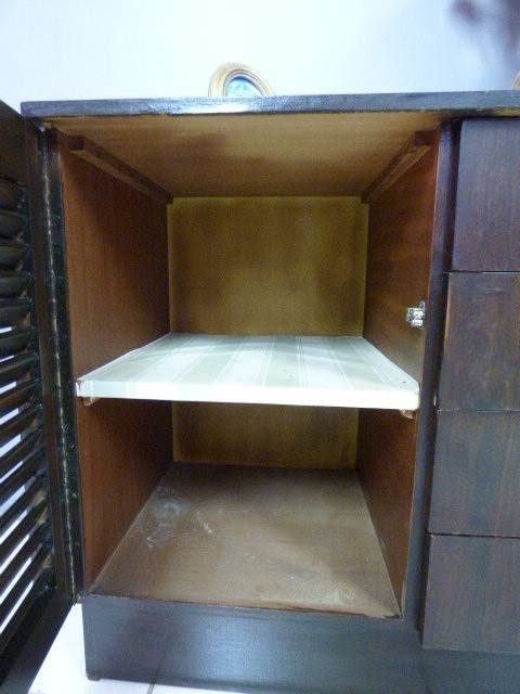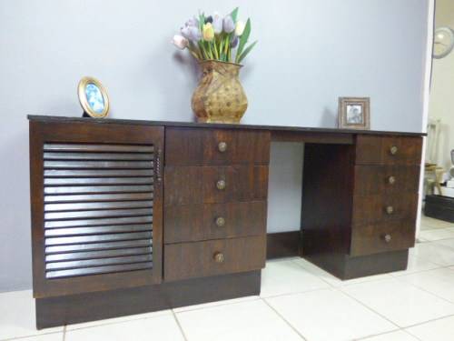 THIS GORGEOUS DRESSING TABLE HAS 8 DRAWERS AND A CUPBOARD THAT HAS LOADS OF SPACE, IT WILL ADD TO ANY BEDROOM DECOR YOU CHOOSE TO PUT IT IN. IT HAS LOVELY HANDLES AND VERY NEAT CLEAN LINES. ONE CAN ADD A MIRROR ON A WALL AND HAVE A FANTASTIC DRESSER. THIS DRESSING TABLE MEASURES 46cm x 186cm x 78cm HIGH. ONE COULD USE THIS AS A DESK OR AN ALL PURPOSE CABINET TOO!! THERE IS AGE AND USAGE RELATED WEAR ON THIS DRESSER AS SHOWN IN THE 5th PIC. THIS IS PERFECT TO PAINT AND RED IN YOUR OWN STYLE.