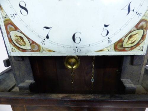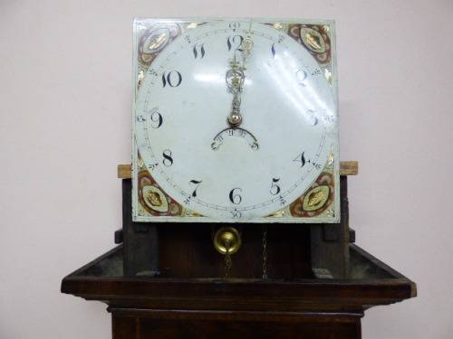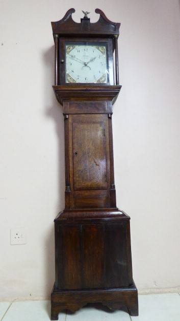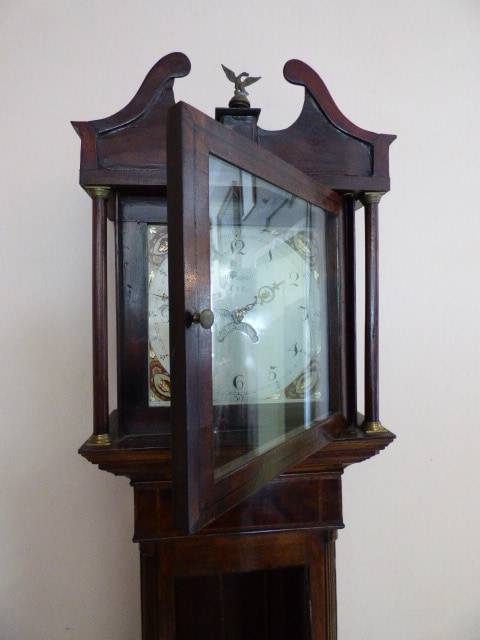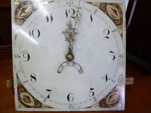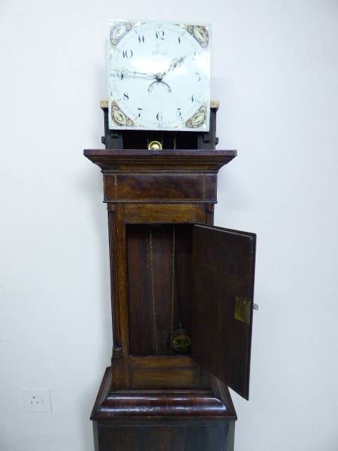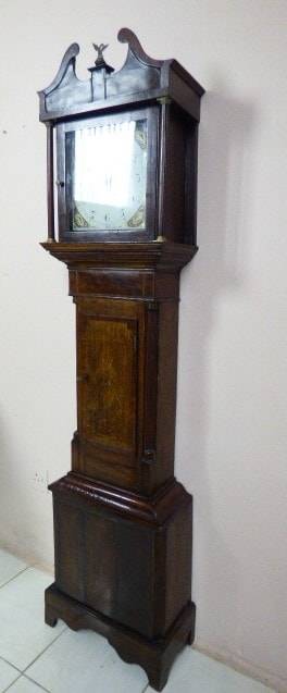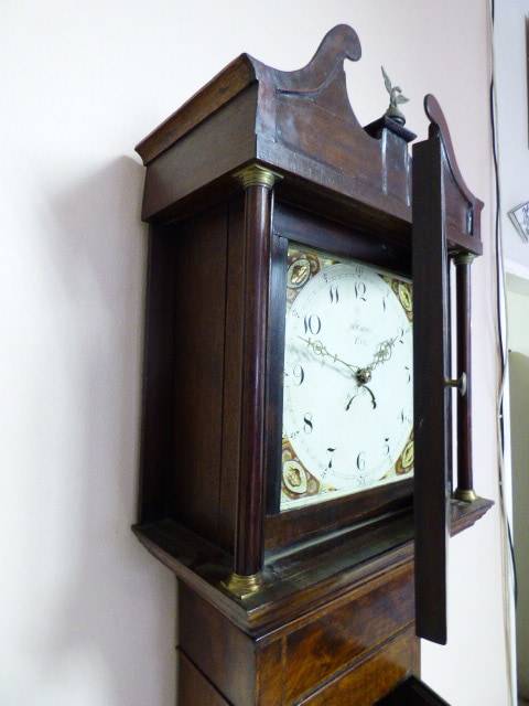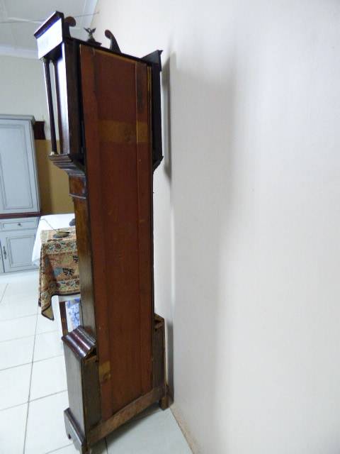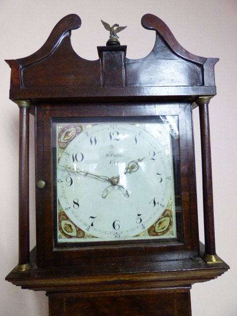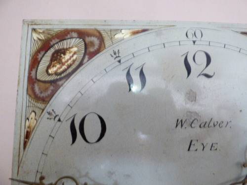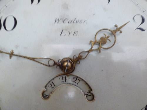 THIS EXTREMELY RARE ANTIQUE (OUR CLOCK MAKER DATES THIS CLOCK BETWEEN 1830-1850) "WILLIAM CALVER" OF EYE (EYE ISLAND, ENGLAND) LONG-CASE CLOCK CHIMES ON THE HOUR AND HAS A ROTATING DATE MECHANISM WHICH IS AN ADDED FEATURE OF THIS AMAZING CLOCK. THE CLOCK IS IN WORKING CONDITION AND HAS JUST BEEN SERVICED. THIS BEAUTIFUL QUALITY ENGLISH MADE GRANDFATHER CLOCK STANDS A WHOPPING 2100mm HIGH x 250mm DEEP AND 550mm WIDE. THE CASE IS A COMBINATION OF ROSEWOOD AND IMBUIA AND HAS GORGEOUS INLAY DETAILING THROUGH-OUT THE CLOCK. THE DETAILING ON THE CLOCK FACE IS HAND PAINTED AS WELL AS THE "SCOTTISH THISTLE" DETAILING ON THE PENDULUM. THERE IS VERY LITTLE INFORMATION ON WILLIAM CALVER AND ONE ARTICLE (BY A COLLECTOR) MENTIONS THAT HE HAS ONLY EVER COME ACROSS THREE WILLIAM CALVER "EYE" CLOCKS IN HIS LIFE TIME. THE CLOCK "RINGS" ON THE HOUR AND IS WOUND WITH A SINGLE CONTINUOUS CHAIN WITH AN IMPOSING WEIGHT. THERE HAS BEEN SOME AESTHETIC TOUCH-UPS, WHICH IS TO BE EXPECTED. THIS IS TRULY A SUBSTANTIAL CLOCK AND ONE OF ONLY A HANDFUL EVER MADE. RECORDS ALSO SHOW THAT ONE OF HIS SILVER WATCHES IS IN THE COLLECTION OF THE BRITISH MUSEUM WITH A HALLMARK OF 1812.