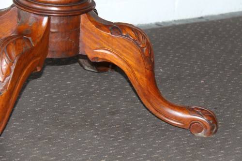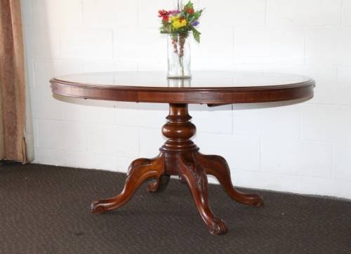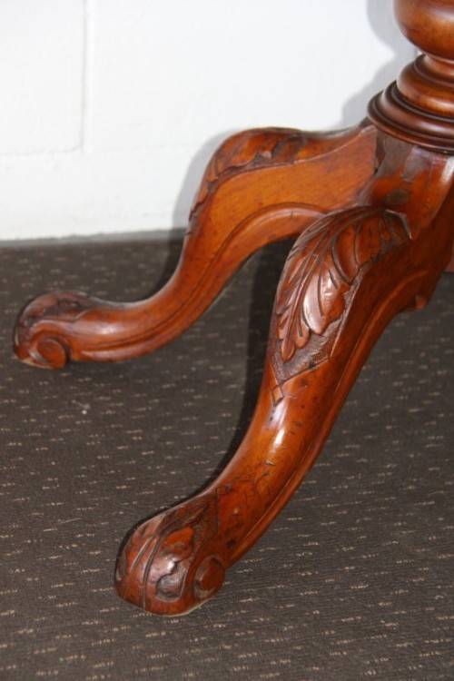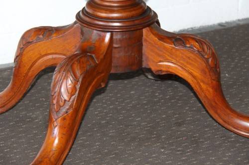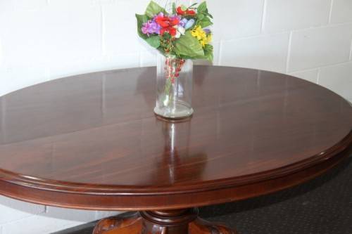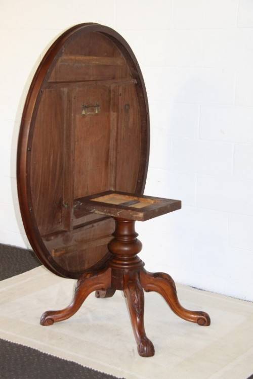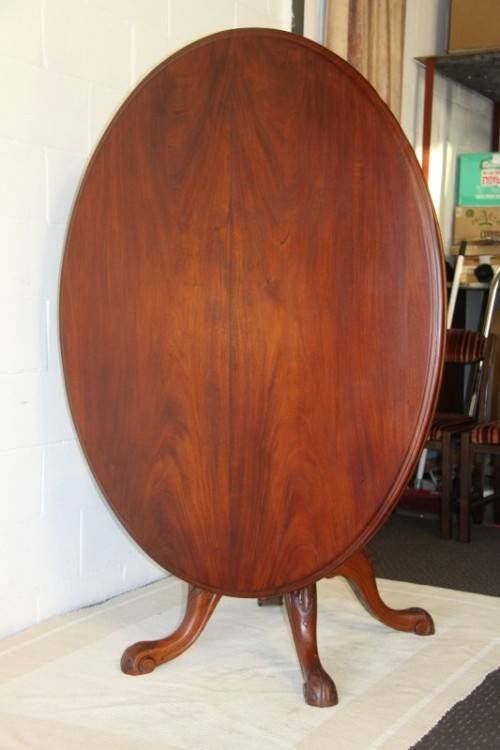 This magnificent antique hand carved carved oval Georgian III revival Rosewood "tilt top" hall table is in spectacular condition and measures an awesome 134cm long x 104.5cm wide x 66.5cm high (about the length and width of a normal 6-seater dining table). The stunning clean lines of the top are beautifully complimented by the elegant hand carved centre leg. The release handle under the table top and the catches are solid brass. This incredible table would look amazing in a large home foyer or double volume hallway, reception room or hotel foyer/ lobby etc. The table top tilts for easy storage/ moving and manoeuvrability. Please view the pics carefully to fully appreciate this spectacular rosewood hall table and to confirm the condition.