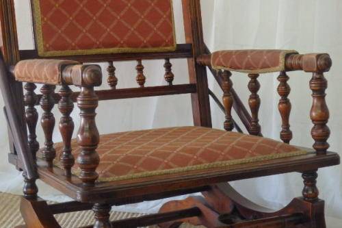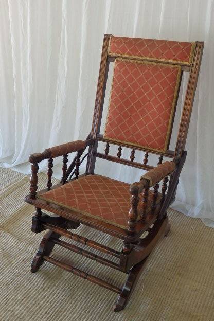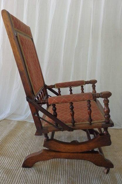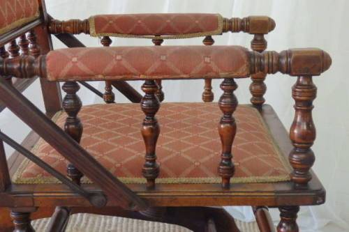 THIS STUNNING ANTIQUE VICTORIAN TURNED BEECH WOOD AMERICAN MECHANICAL ROCKING CHAIR WITH THE ORIGINAL CASTORS ON THE FRONT LEGS, PADDED ARM RESTS AND A DECORATIVE ARCHED SPRING LOADED BASE WITH TURNED SUPPORTS IS A SUPERB FIND AND DATES TO THE LATE 1800’s. THE ROCKING CHAIR MEASURES 570mm LONG x 660mm WIDE x 1030mm HIGH. THE CHAIR IS COVERED IN A CLARET RED FABRIC WITH A GOLDISH CRISS-CROSS PATTERN AND FINISHED WITH GOLD EDGING. I WOULD RECOMMEND THAT THE CHAIR BE RECOVERED OR GIVEN A GOOD CLEAN. PLEASE VIEW THE PICS CAREFULLY TO CONFIRM THE CONDITION OF THE CHAIR AND TO FULLY APPRECIATE THIS AMAZING 120+ YEAR OLD MECHANICAL ROCKING CHAIR.
