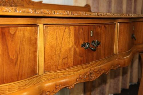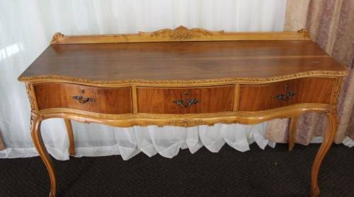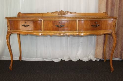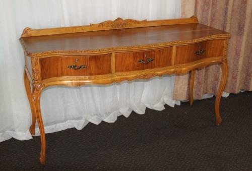 THIS MAGNIFICENT BURMESE TEAK 3-DRAWER DINING BUFFET SIDE SERVER WITH AMAZING HAND CARVED DETAILING MEASURES A VERY DECENT 1700mm LONG x 560mm WIDE x 965mm HIGH. THE BUFFET SERVER HAS A CARVED SPLASHBACK WITH CARVED DETAILING AROUND THE TOP THAT FLOWS INTO THE INCREDIBLE CARVED DETAILING OF THE LEGS AND STYLED FACADES. THERE IS A SMALL MARK ON THE TOP (SEE PICS). THE DRAWERS CAN LOCK AND THE KEYS ARE INCLUDED. THE BUFFET SERVER MAKES A STATEMENT AND NO EXPENSE WAS SPARED IN MAKING THIS SERVER A TOP-END HIGH QUALITY PIECE THAT WOULD BE FOUND IN THE MOST DISCERNING HOMES. THERE IS MINIMAL/ NORMAL USAGE RELATED WEAR AND TEAR. PLEASE VIEW THE PICS CAREFULLY TO FULLY APPRECIATE THIS TRULY STUNNING BURMESE TEAK SIDE SERVER AND TO CONFIRM THE CONDITION.