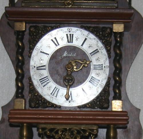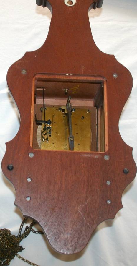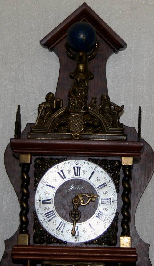 Old Wall Clock Dutch Zaandam Zaanse wall Clock WARMINK WUBA This clock has beautiful, good quality wood. It contains a movement of seven days. This lovely item chimes every half and whole hour with a beautiful sound. This clock is weight driven by two pear shaped weights. Warmink makes this kind of clocks.The clock has a gilted German hourwork. Also there is a wonderful figure of Atlas being represented, holding a globe. Underneath him, we see three beautifully crafted humans. This makes the clock a unique piece of eye-catching "furniture," that will bring new life into every room or place. The clockwork of this item is in a really good conditions; it is checked and oiled. The dial is beautifully engraved This clocks are very famous in the Netherlands.