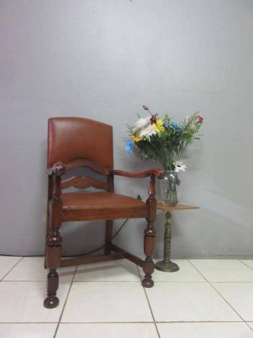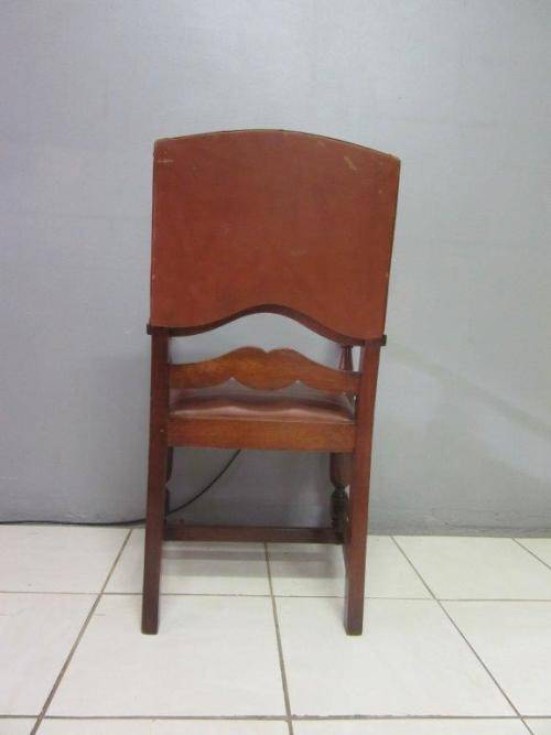 This magnificent Edwardian antique solid Cognac Oak chair with period style upholstery is in beautiful condition for its age and looks great. The chair has wear and tear consistent with its impressive age that dates back to around the 1920's but the upholstery is still in good condition (although it has some scuffs on the back) and the chair is very sturdy and well made. The chair measures 62cm long x 59cm wide x 102cm high. These antique chairs are very collectable and are becoming quite scarce - especially in this condition! Please view the pics to confirm the condition of this antique chair.