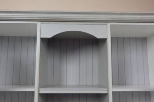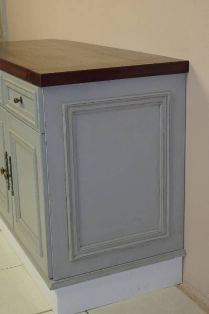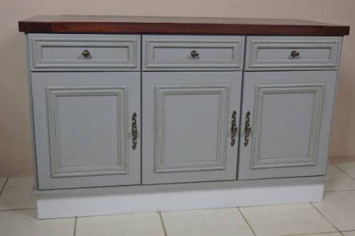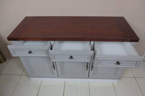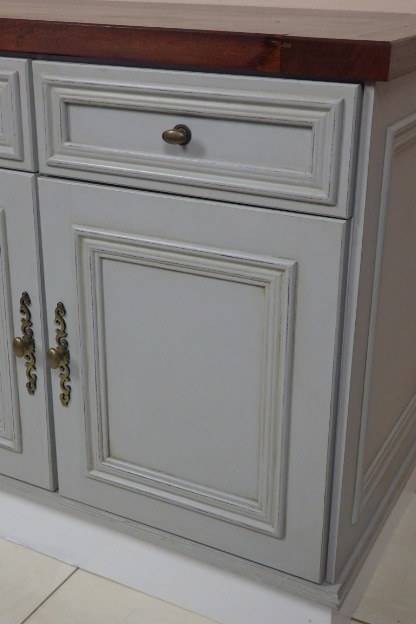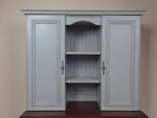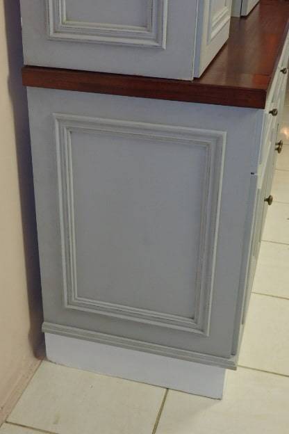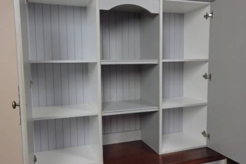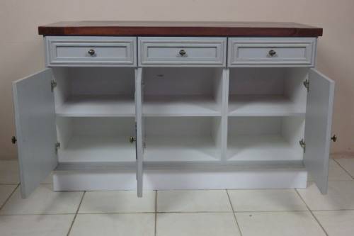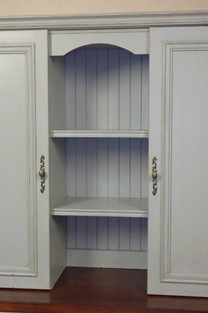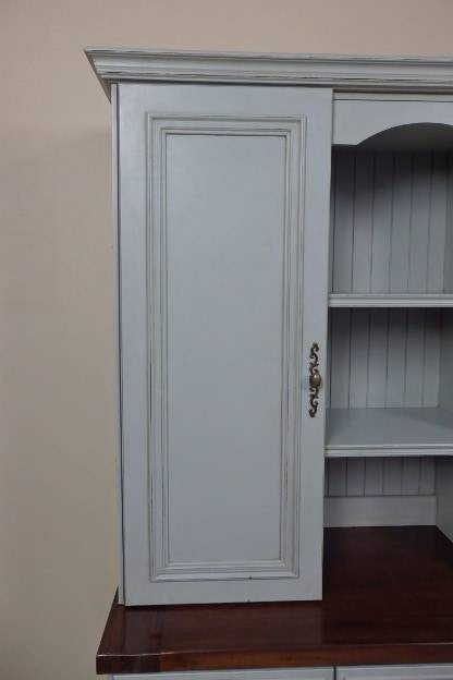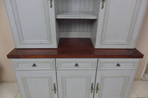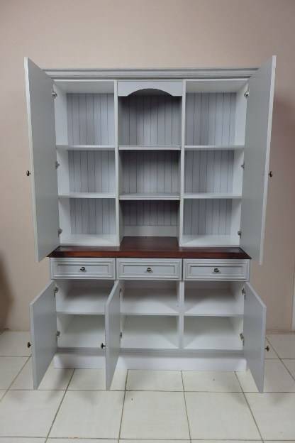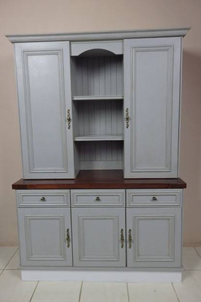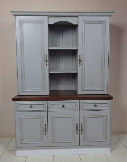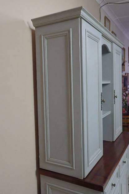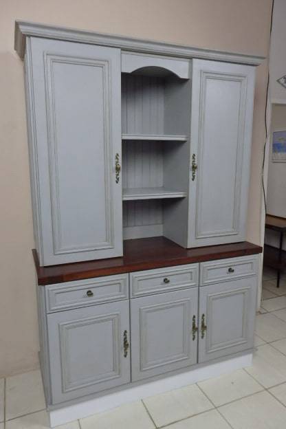THIS MAGNIFICENT AND EXPENSIVE QUALITY FREESTANDING KITCHEN CABINET UNIT WITH A THICK WOODEN COUNTER TOP HAS AMPLE PACKAGE SPACE IS IN TWO SECTIONS WITH THE COUNTER TOP "BASE" SEPARATE FROM THE TALL CABINET SECTION (EASIER TO MOVE). THE UNIT IS A WHOPPING 2.2 METERS HIGH (2200mm x 580mm DEEP x 1500mm LONG). THE BASE HAS THREE CUPBOARDS WITH DRAWERS ABOVE THE DOORS AND THE TOP HAS TWO OUTER CUPBOARDS WITH A CENTRE DISPLAY SECTION. THE UNIT IS A MELAMINE FRAME WITH SOLID WOODEN FASCIA AND HAS BEEN PAINTED IN A STUNNING GREY WITH WHITE COMPLIMENTARY INTERIORS. THERE IS MINOR WEAR AND TEAR. THIS IS A QUALITY PIECE THAT WOULD BE VERY EYE CATCHING IN A KITCHEN, AND WOULD BE AMAZING IN AN ENTERTAINMENT ROOM OR LAPA ETC.