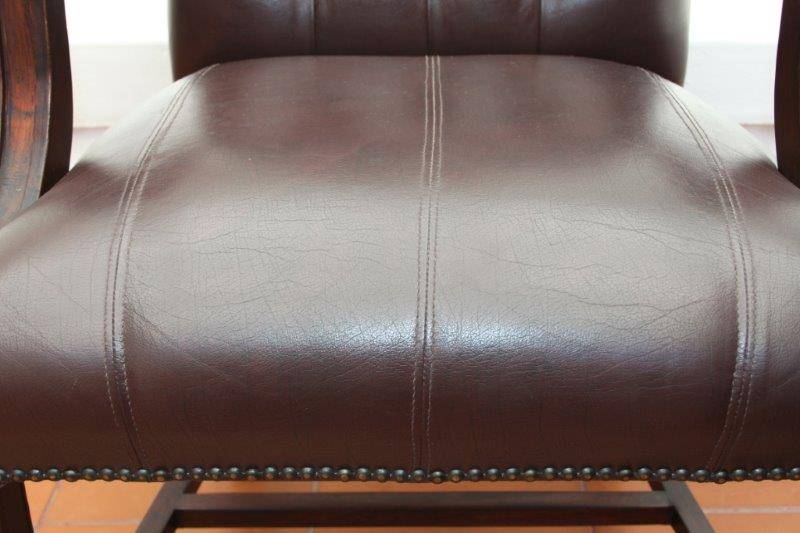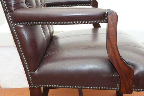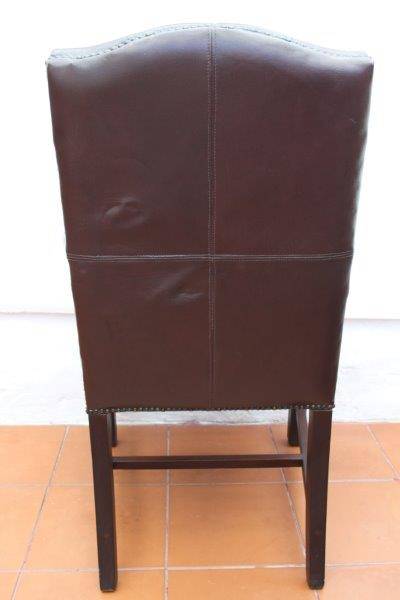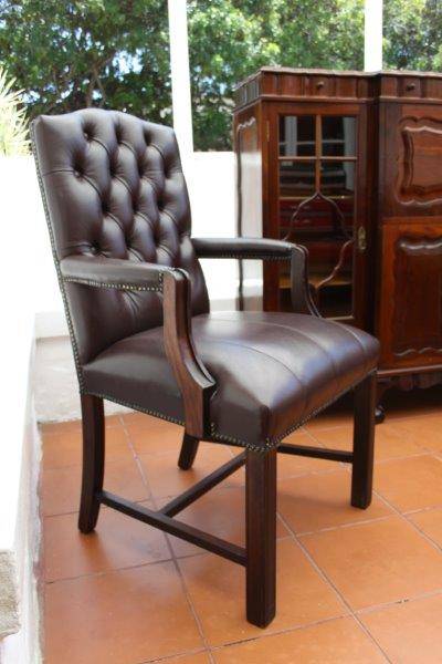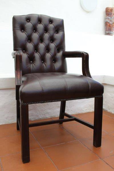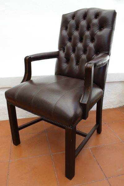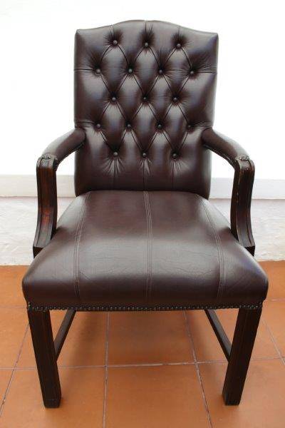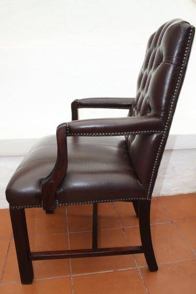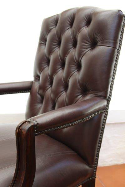 WE ARE OFFERING A MAGNIFICENT GENUINE LEATHER & SOLID MAHOGANY 'CHESTERFIELD STYLE' EXECUTIVE OFFICE CHAIR IN EXCELLENT CONDITION!!! THIS IS A STUNNING PIECE OF FURNITURE AND WORKS SO WELL IN A LARGE EXECUTIVE OFFICE OR AS AN OCCASIONAL READING CHAIR.... IT IS ALSO VERY COMFORTABLE!!! THIS CHAIR STILL HAS THE ORIGINAL RICH & LUXURIOUS DARK BROWN GENUINE LEATHER AND FINSHED OFF WITH BEAUTIFUL STUDS AND EXQUISITE SIMPLE DETAILING!!!