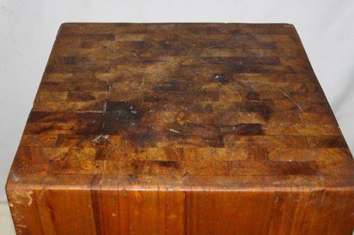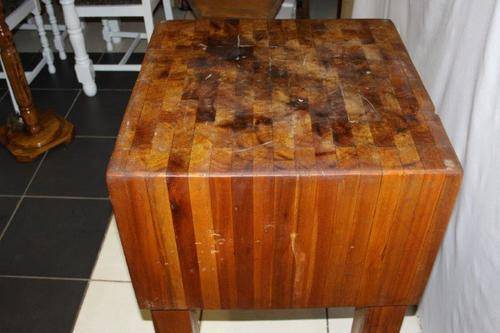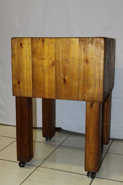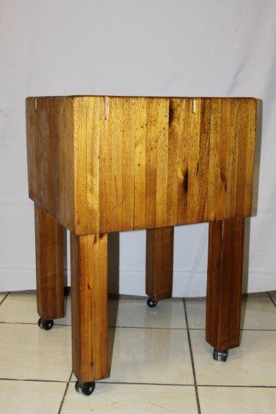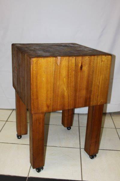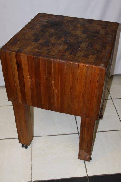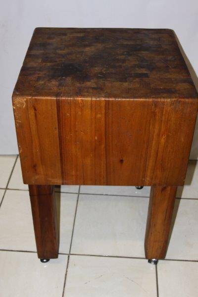 THIS IS A MAGNIFICENT AND AUTHENTIC LAMINATED BUTCHERS BLOCK ON CASTOR WHEELS AND IN EXCELLENT CONDITION FOR THE AGE!!! EVERY COUNTRY KITCHEN SHOULD HAVE ONE AND THIS ONE IS PARTICULARLY AWESOME!!! STUNNING KITCHEN FURNITURE!!! THE SIZE OF THE BUTCHERS BLOCK IS APPROXIMATELY 600mm x 600mm x 900mm HIGH.