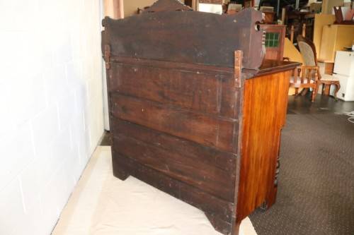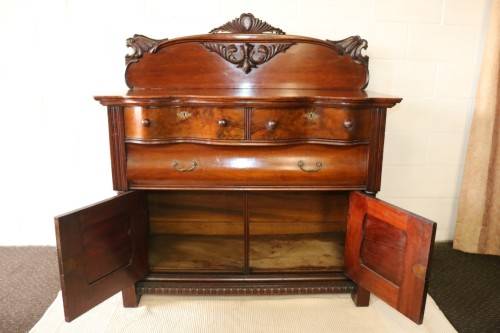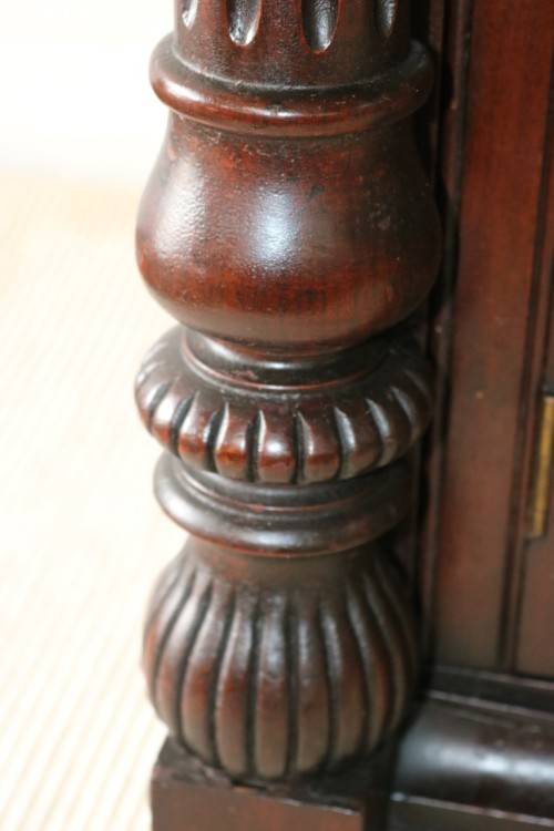 This truly breathtaking hand carved Victorian (early) Art Nouveau (c1890) antique Rosewood and Mahogany chiffonier side server is magnificent and has spectacular hand carved lion and griffin figures and incredible carved detailing throughout the chiffonier. This three-drawer side server is in fantastic condition for it's age (over 120 years old) with some character scuffs on the surface (see pics). It is a truly stunning, extremely rare, and magnificent piece of furniture! The wood grain and colour is incredible. The size of the chiffonier measures a very decent 122cm long x 58cm wide x 132cm high. There is a key for the drawers and cupboards. Please view the pictures carefully to fully appreciate this awesome antique cabinet and to confirm the condition.