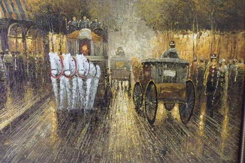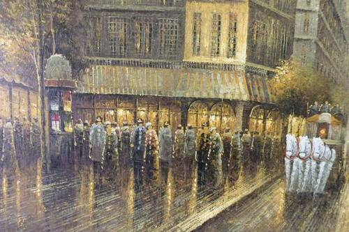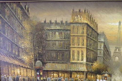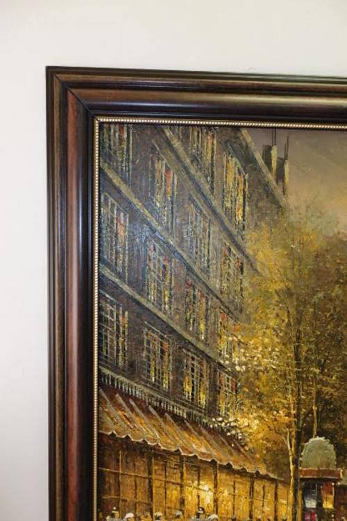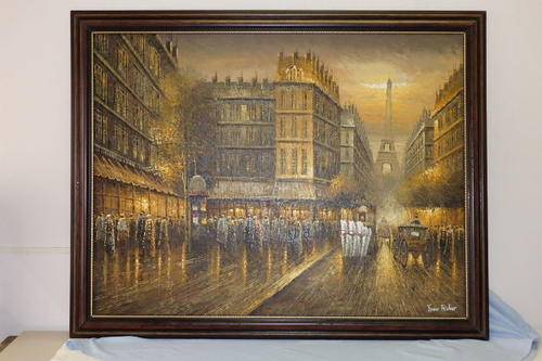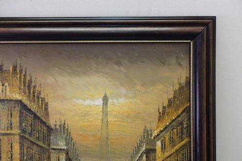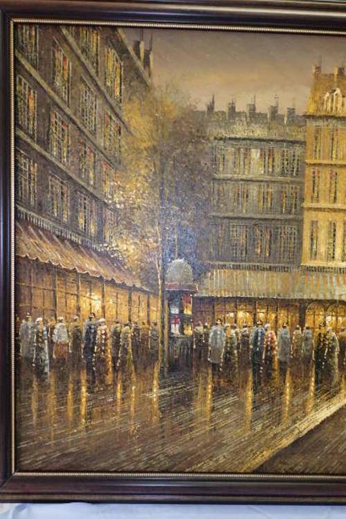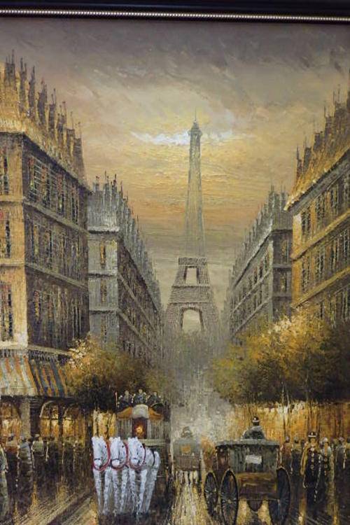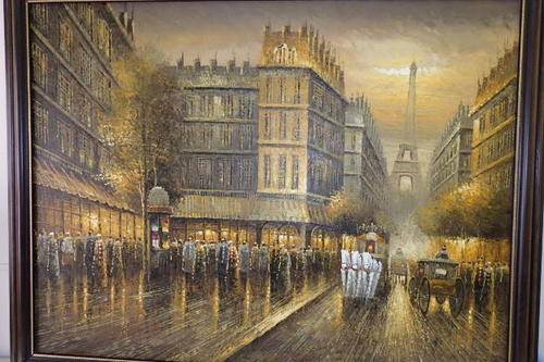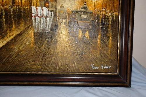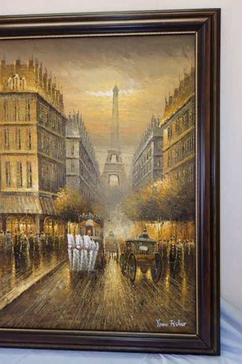 THIS MUST BE ONE OF THE MOST INCREDIBLE AND LARGEST "TURN OF THE CENTURY" PARIS STREET SCENE PAINTINGS THAT WE HAVE HAS ACROSS OUR FLOOR. THIS MAGNIFICENT HUGE (136.5cm LONG x 106.5cm TALL) ORIGINAL OIL ON BOARD PAINTING OF A PARISIAN STREET SCENE WITH THE EIFFEL TOWER IN THE BACKGROUND HAS BEEN FRAMED IN A BROAD FRAME. THE DETAILING AND FINISHINGS ON THIS PAINTING ARE QUITE REMARKABLE. THE PAINTING WAS PAINTED BY WELL KNOWN ARTIST YUAV FISHER. THIS PAINTING NEEDS A BIG WALL AND WILL BE A FOCAL POINT.