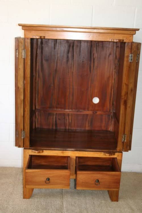This magnificent Indonesian teak entertainment cabinet/ cupboard with traditional solid brass embellishments is in superb condition and measures 92cm long x 61.5cm wide x 150cm high. The double-door cabinet is the ideal TV cabinet, and with a few shelves, could also be a very stunning drinks cabinet. The cabinet has two storage drawers. The doors fold completely out of the way when they are opened. Please view the pics carefully to fully appreciate this magnificent and very well made unit and to confirm the condition.