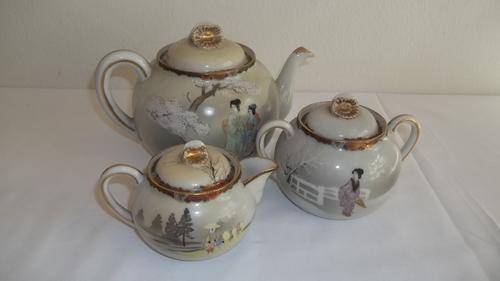 THIS MAGNIFICENT AUTHENTIC JAPANESE TRANSLUCENT PORCELAIN TEAPOT, LIDDED MILK JUG AND LIDDED SUGAR BOWL HAVE BEEN INDIVIDUALLY HANDMADE AND INDIVIDUALLY HAND PAINTED BY A MASTER POTTERY CRAFTSMAN. NO TWO PIECES ARE IDENTICAL INCLUDING THE SIZE OF THE PIECES AS WELL AS THE ARTWORK. THE MASTER POTTER MAKES USE A BASIC MOULD TO GET THE GENERAL SHAPE OF THE PIECES, AFTER WHICH HE THEN FORMS, BAKES AND HAND PAINTS THE THEMES ONTO THE PORCELAIN. TRANSLUCENT PORCELAIN IS ONE OF THE RAREST TYPES OF PORCELAIN AND ONLY TRUE CRAFTSMAN ATTEMPT TO MAKE IT. TO FIND A SET SUCH AS THIS IN THE IMMACULATE CONDITION THAT THIS SET IS IN, IS A RARITY. BECAUSE OF THE NATURE AND FRAGILITY OF THE PORCELAIN, TO FIND A COMPLETE SET WITHOUT CRACKS AND CHIPS IS VERY RARE INDEED. DON'T MISS OUT ON THIS RARE FIND!!!