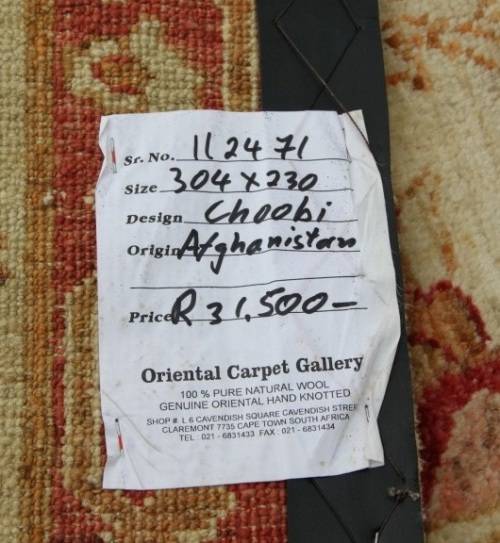 THIS MAGNIFICENT LARGE TRADITIONAL AFGHAN CHOBI PERSIAN CARPET IS IN WONDERFUL CONDITION AND MEASURES A VERY DECENT 3040mm LONG x 2300mm WIDE. THE CARPET IS IN STUNNING CONDITION FOR ITS AGE AND HAS MINIMAL/ NORMAL WEAR AND TEAR ASSOCIATED TO A VINTAGE CARPET. THIS AMAZING CHOBI CARPET IS THE IDEAL CARPET FOR FOR A LARGER MORE FORMAL LIVING ROOM OR BEDROOM OR EVEN AN EXECUTIVE'S OFFICE. CHOBI CARPETS ARE HAND KNOTTED CARPETS AND ARE TRADITIONALLY BEIGE CARPETS ACCENTUATED WITH DEEP RED MOTIFS AND PATTERNS AND FINISHED WITH BEAUTIFUL EARTHY TONES. THE CARPET ALSO HAS A "NON-SLIP" UNDER CARPET. PLEASE VIEW THE PICTURES CAREFULLY TO FULLY APPRECIATE THIS TRULY STUNNING AFGHAN CHOBI CARPET AND TO CONFIRM THE CONDITION OF IT. YOU WILL NOTE THE PRICE TAG ON THE CARPET - THAT WAS IN EXCESS OF TEN YEARS AGO.