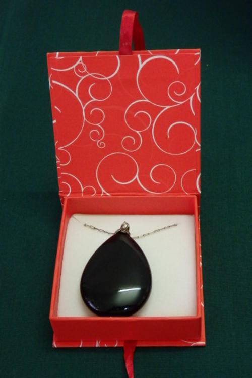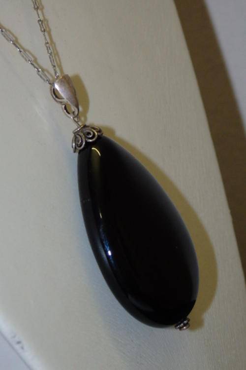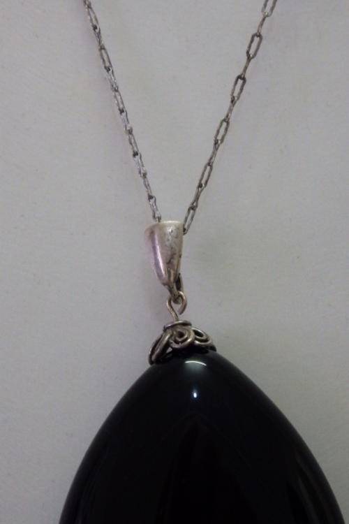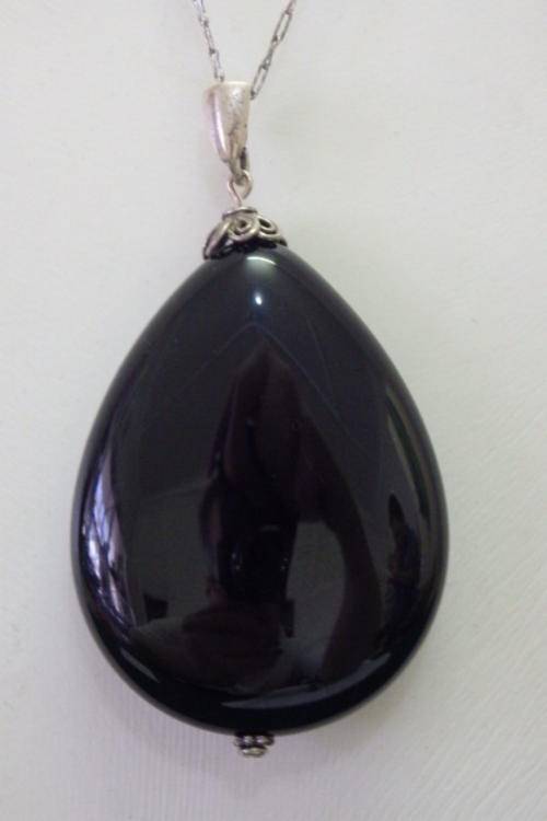 THIS MAGNIFICENT LARGE BLACK OBSIDIAN? PENDANT ON A BEAUTIFUL STERLING SILVER CHAIN IS IN A WONDERFUL GIFT BOX AND READY FOR THAT SOMEONE SPECIAL. THE LARGE TEARDROP STONE MEASURES A VERY DECENT 7cm x 4cm. I'M INCLINED TO BELIEVE THAT THE STONE IS OBSIDIAN (VOLCANIC GLASS) WHICH WAS VERY POPULAR AMONGST THE RED INDIANS WHO MADE ARROWHEADS OUT OF THE STONE. IT IS ALSO COMMONLY REFERRED TO AS A "PURITY" STONE. THE CHAIN ON THIS EXQUISITE PENDANT IS 54cm LONG.