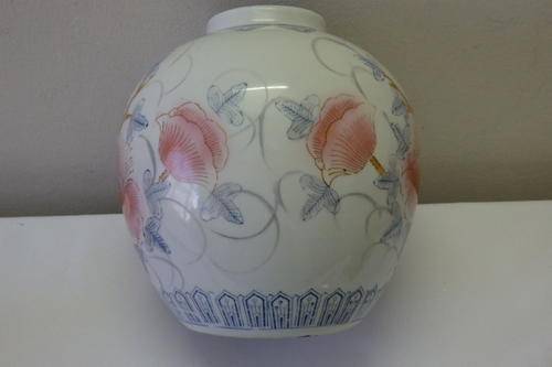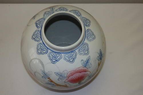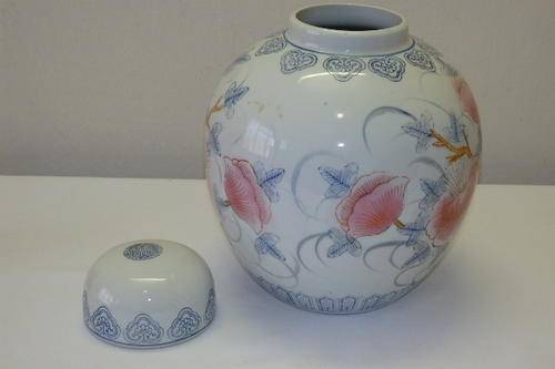 THIS MUST BE THE LARGEST GINGER JAR WE HAVE HAD BEFORE. THIS MAGNIFICENT LARGE (27cm TALL x 20cm WIDE) CHINESE PORCELAIN HAND PAINTED GINGER JAR IS IN PRISTINE CONDITION AND A STUNNING EXAMPLE OF THE AUTHENTIC GINGER JARS. GINGER JARS WERE USED AS STORAGE JARS FOR GINGER (A RARE SPICE IN IT'S DAY), HERBS AND SPICES AND THE LIKES. THE BASE OF THE GINGER JAR HAS AN ORIENTAL BACK STAMP. THERE ARE NO CHIPS OR CRACKS IN THIS STUNNING BLUE AND WHITE JAR WITH PINK FLOWERS.