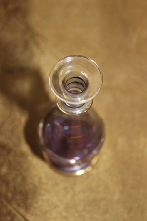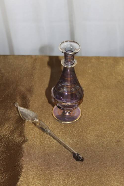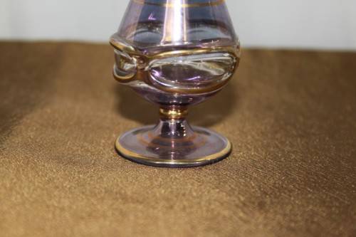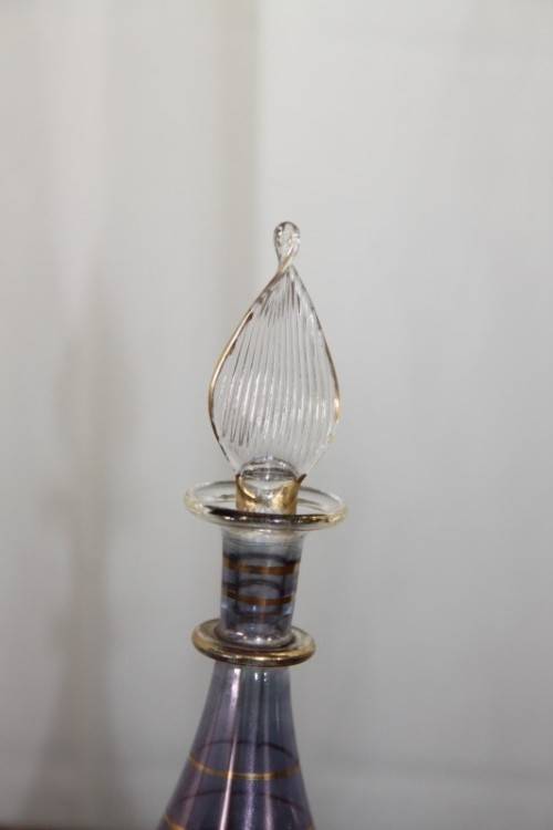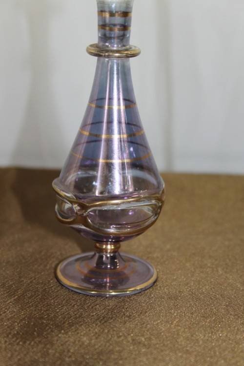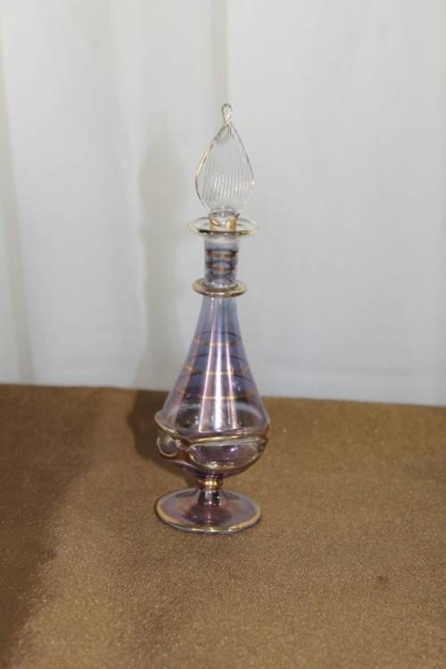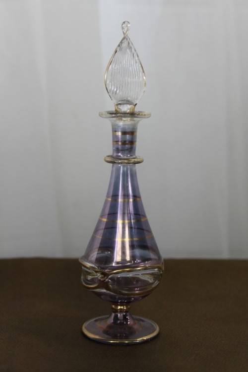 THIS SPECTACULAR AND RARE HAND BLOWN MURANO OF ITALY GLASS PERFUME BOTTLE WITH A GLASS STOPPER/ APPLICATOR MEASURES 15cm TALL AND HAS BEEN BEAUTIFULLY FINISHED WITH GOLD GILDING AROUND THE BOTTLE AND APPLICATOR. THERE ARE ABSOLUTELY NO CHIPS OR CRACKS IN THE GLASS. THESE PERFUME BOTTLES ARE RARE AND HUGELY COLLECTIBLE AND VERY BEAUTIFULLY MADE AND THE DARK LILAC COLOUR OF THE GLASS MAKES IT A PARTICULARLY PRETTY PERFUME BOTTLE. PLEASE VIEW THE PICTURES CAREFULLY TO FULLY APPRECIATE THIS VERY PRETTY MURANO PERFUME BOTTLE AND TO CONFIRM THE CONDITION.