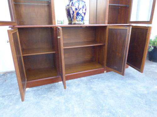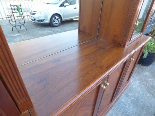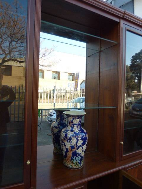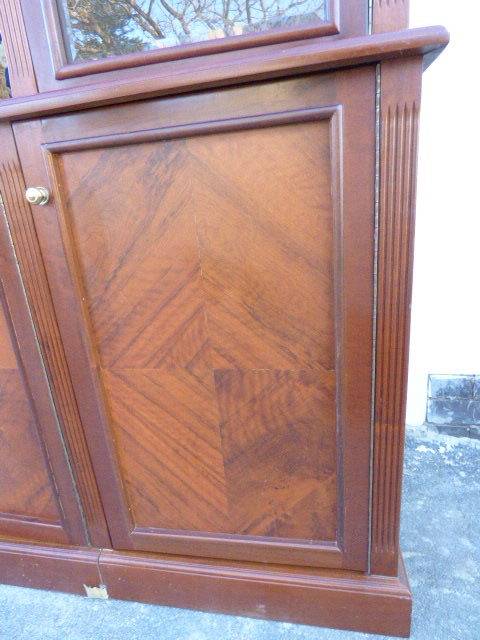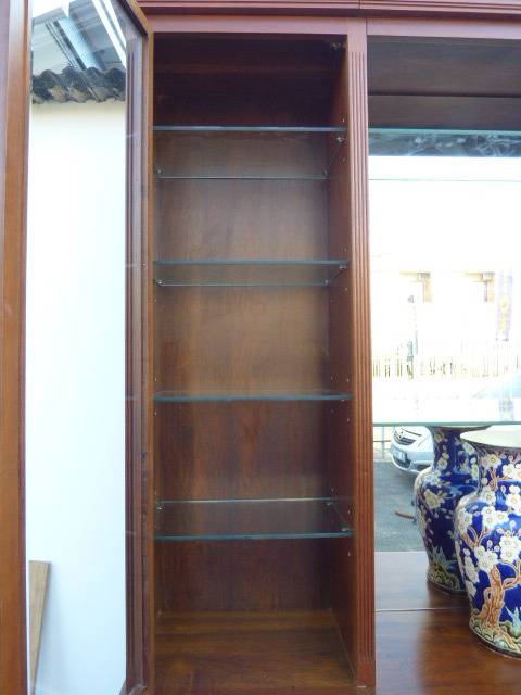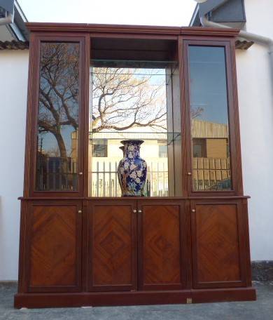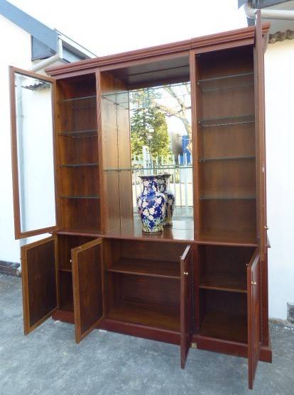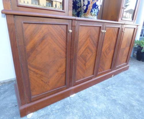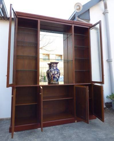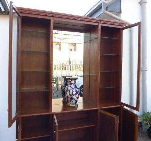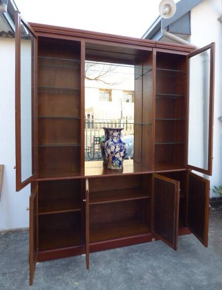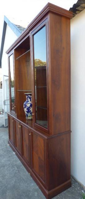 THIS MAGNIFICENT, "LARGE" CUSTOM MADE WOOD/VENEER DISPLAY/ALL PURPOSE CABINET WAS SPECIALLY COMMISSIONED AND IS SPECTACULAR, THERE IS NO OTHER LIKE IT! IT HAS LOADS OF SPACE. IT HAS BEAUTIFUL BEVELLED GLASS DOORS AND LARGE CUPBOARDS. THIS STUNNING CABINET WILL SUITE A LARGE FORMAL LOUNGE TO DISPLAY SPECIAL PIECES, A STUDY, DOCTORS ROOM, LAWYERS OFFICES OR A BOARDROOM WITH SPACE FOR BOOKS AND FILES. THE SHELVES ARE A NICE SIZE. IT MEASURES APPROXIMATELY 46cm x 204cm x 255cm HIGH. THIS IS AN OUTSTANDING PIECE OF FURNITURE!!!! THIS CABINET IS IN FANTASTIC CONDITION.