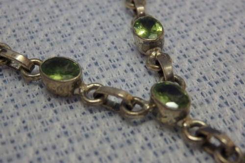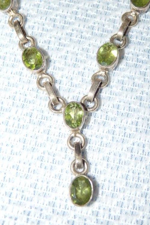 THIS MAGNIFICENT STERLING SILVER (STAMPED 925) LADIES NECKLACE HAS 10 OVAL PERIDOT STONES AND IS IN FANTASTIC CONDITION. THE NECKLACE MEASURES 48cm LONG AND HAS AN ADDITIONAL 2.5cm EXTENDER. THE NECKLACE WEIGHS 14.44g. THIS IS A VERY BEAUTIFUL NECKLACE AND WOULD LOOK INCREDIBLE WITH AN OPEN NECK DRESS.