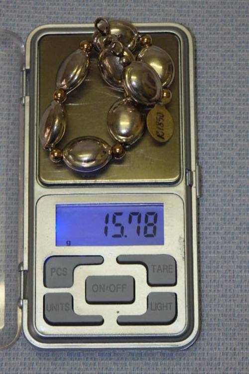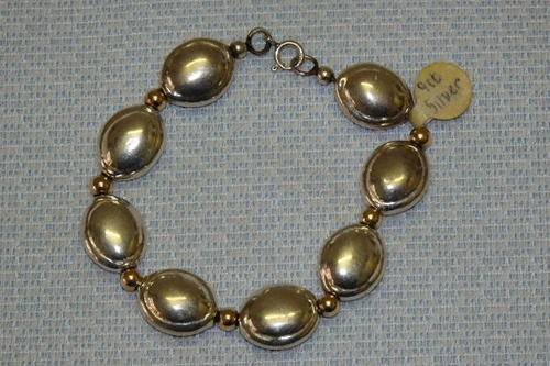 THIS MAGNIFICENT STERLING SILVER AND 9ct GOLD COMBINATION LADIES BRACELET IS IN WONDERFUL CONDITION AND MEASURES 20cm LONG. THE WEIGHT OF THE BRACELET IS 15.78g. THE EIGHT LARGER SILVER "BEADS" ARE SEPARATED BY SEVEN ROUND GOLD BEADS. THIS IS SUCH AN UNUSUAL PIECE, BUT YET SO SIMPLE AND ELEGANT.