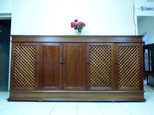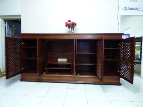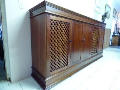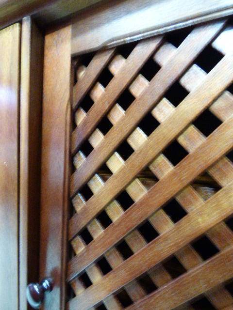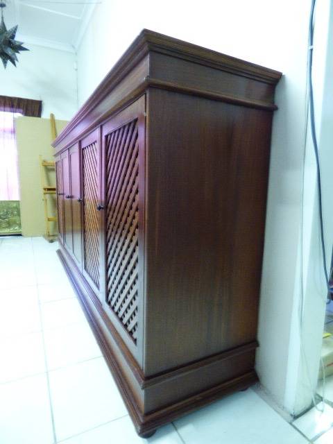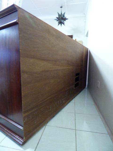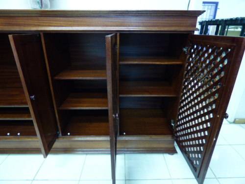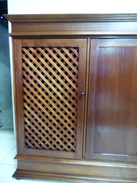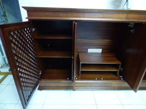 THIS MAGNIFICENT, LARGE VENEER TV, DRINKS / ALL PURPOSE CABINET IS FABULOUS! IT HAS LOADS OF SPACE. IT HAS BEAUTIFUL LATTICE WORK DOORS AND LARGE CUPBOARDS. THE DOORS FOR THE TV SECTION SLIDE INTO THE SIDES. THIS GORGEOUS CABINET WILL SUITE A LARGE ENTERTAINMENT AREA AS AN ALL PURPOSE CABINET, ON YOUR PATIO AS A LARGE SIDE SERVER OR IN A BOARDROOM FOR DRINKS. IT MEASURES APPROXIMATELY 58cm x 272cm x 134cm HIGH. THIS IS A FABULOUS PIECE OF FURNITURE!!!! THIS CABINET IS IN FANTASTIC CONDITION.