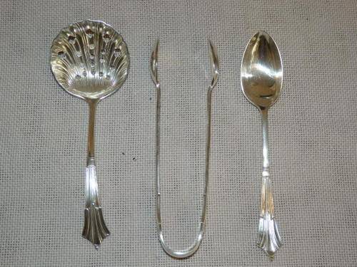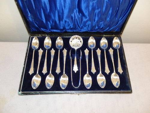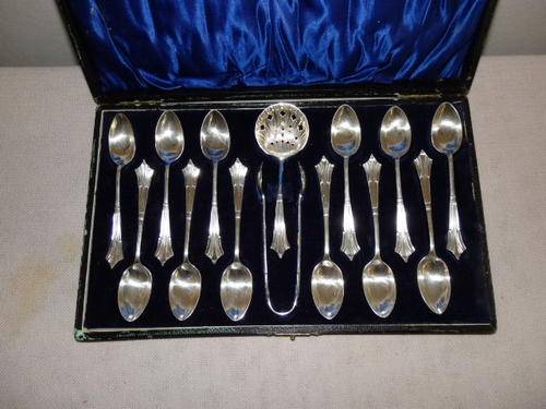 THIS MUST BE ONE OF THE MOST BEAUTIFUL SILVER PLATED TEA SETS THAT I HAVE SEEN. THE SET IS COMPLETE WITH 12 TEASPOONS, A MATCHING PAIR OF SUGAR CUBE TONGS AS WELL AS A LARGE SUGAR SPOON THAT COULD DOUBLE UP AS A JAM SPOON. I DOUBT THAT THE SET WAS EVER USED. THE SET IS IN THE ORIGINAL BOX, WHICH HAS A LITTLE WEAR AND TEAR ON THE OUTSIDE. THIS AWESOME SET WOULD COMPLIMENT ANY BONE CHINA SET SET.