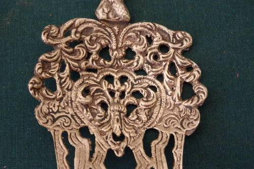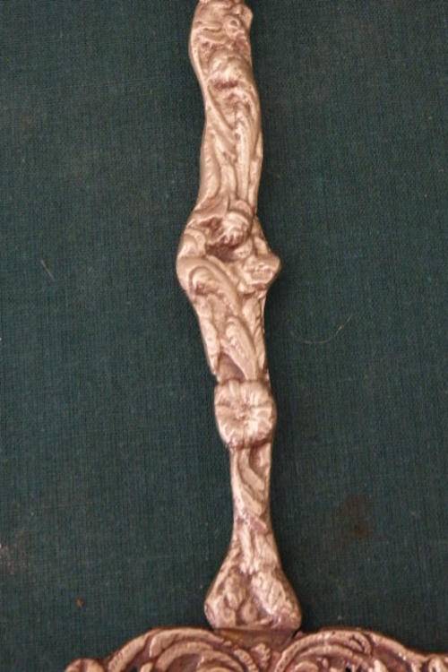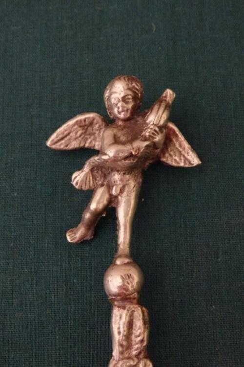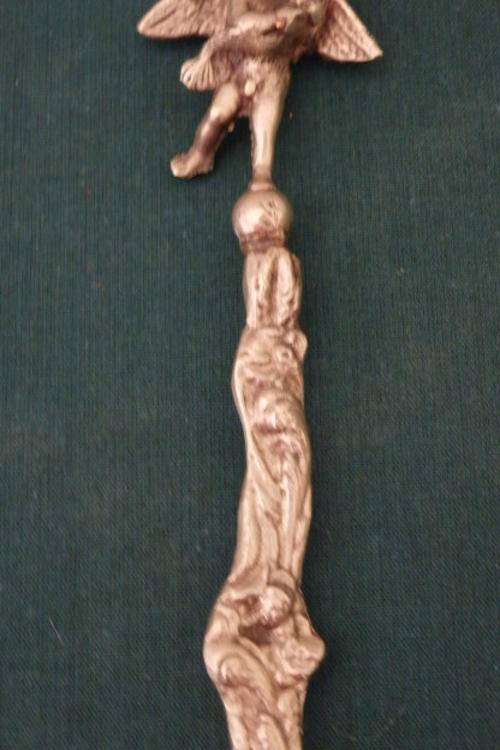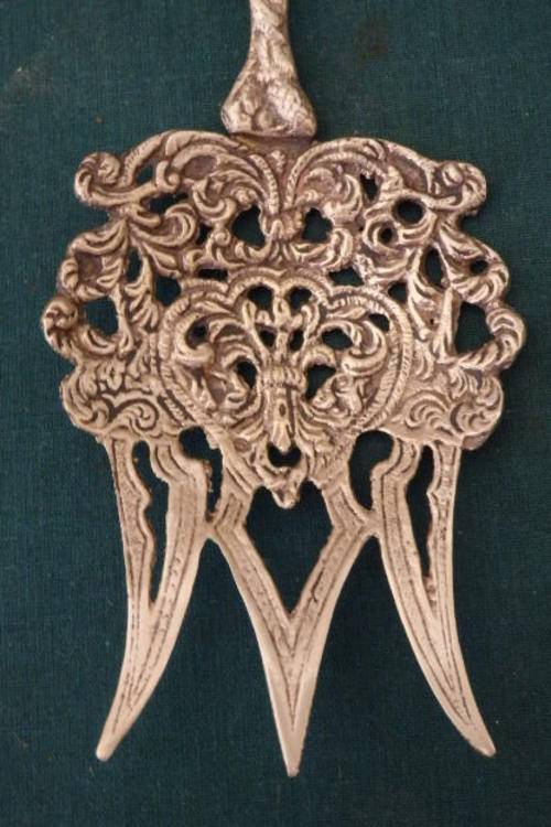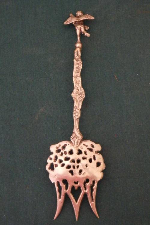 THIS MAGNIFICENT VINTAGE ITALIAN MADE "BAROQUE STYLE" CHERUB MEAT FORK BY WELL KNOWN ITALIAN SILVERSMITH UGO BELLINI MEASURES ROUGHLY 26.5cm LONG. UGO BELLINI STARTED HIS CAREER IN 1946 AND WAS EXCEPTIONALLY WELL KNOWN FOR HIS "BAROQUE STYLE" LADIES COMPACTS WITH ENAMELLING AND EXQUISITE DETAILING. UGO BELLINI WORKED IN GOLD, SILVER, SILVER PLATE AND BRASS AND ALSO EVENTUALLY BRANCHED OUT INTO ORNATE JEWELLERY. THIS MEAT FORK IS SILVER PLATE ON NICKEL.
