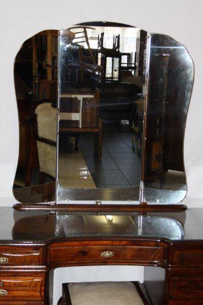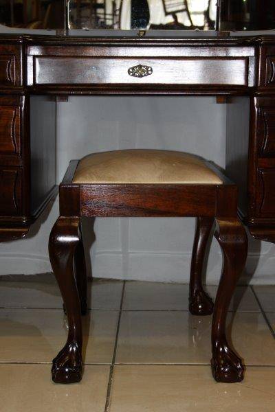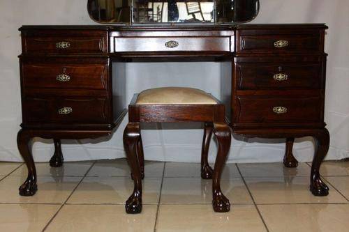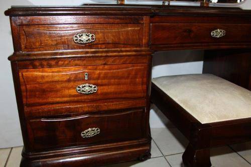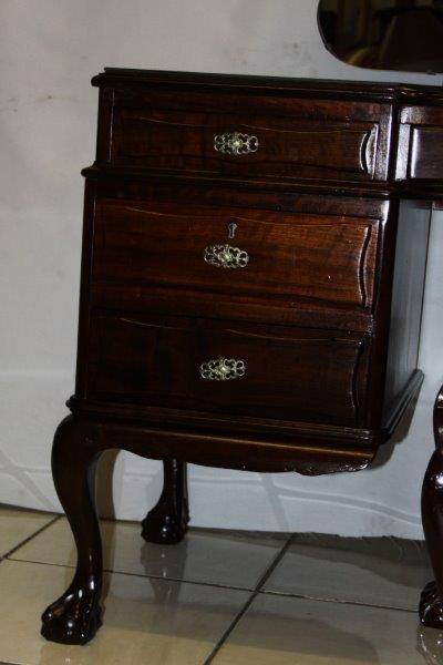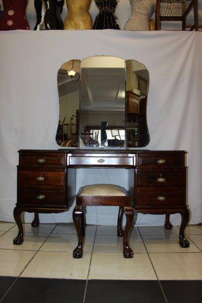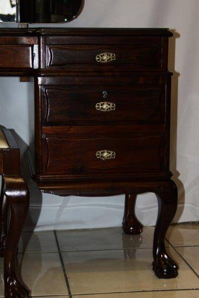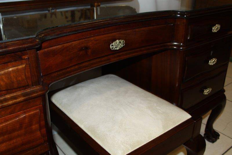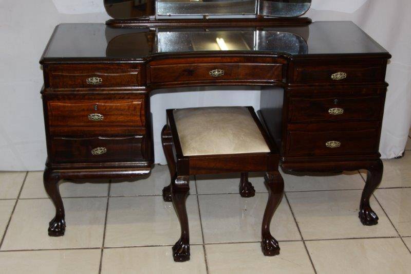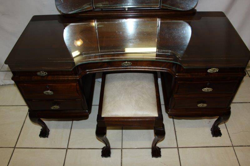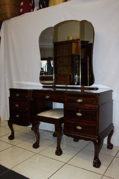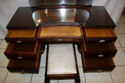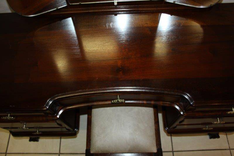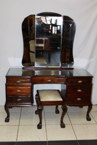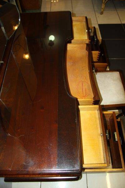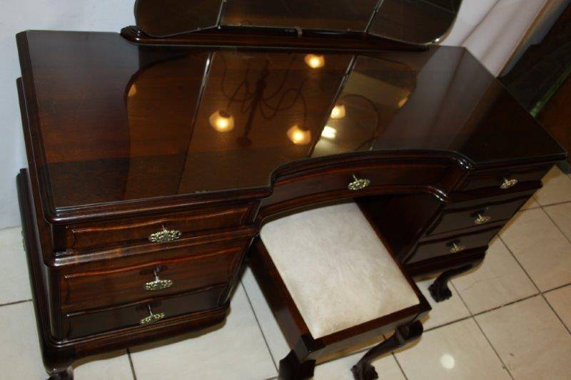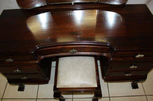 THIS IS A STUNNING, UNIQUE SOLID IMBUIA DRESSING TABLE WITH 7 DRAWERS AND A STUNNING CURVED MIRROR!!! THE TOP IS PROTECTED BY A GLASS THAT HAS BEEN CUT OUT TO FIT THE TOP! AN EXQUISITE PIECE OF FURNITURE IN FANTASTIC CONDITION FOR IT'S AGE!!! THE DRESSER IS APPROXIMATELY 1300mm x 500mm x 1700mm HIGH. PLEASE VIEW THE PICS CAREFULLY FOR MORE DETAIL AND CONDITION AS THIS FORMS PART OF THE DESCRIPTION. WHAT YOU SEE IS WHAT YOU GET!!! POSTAGE IS NOT POSSIBLE SO PLEASE VIEW OUR SHIPPING OPTIONS OR ARRANGE FOR COLLECTION IN EDENVALE FREE OF CHARGE!