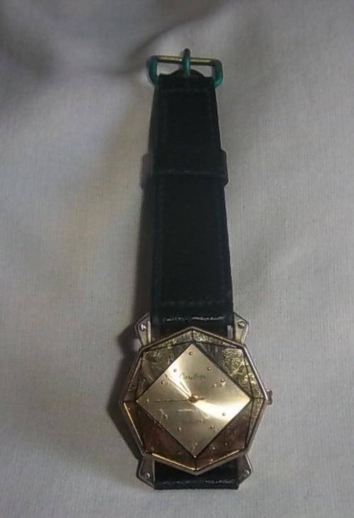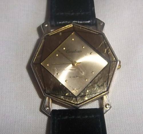 A MEN'S QUARTZ CARITIAR WRIST WATCH.  A VERY NICE DESIGN.  WORKING.  SOME WARE BUT OVER ALL FAIR CONDITION.