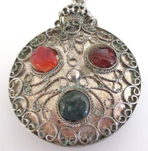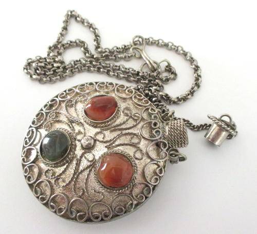 A METAL PERFUME BOTTLE WITH SEMI-PRECIOUS STONES