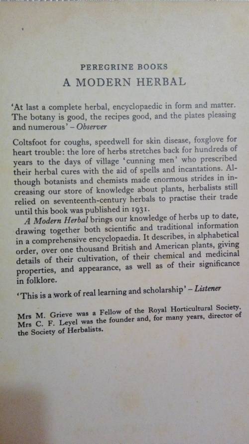 A MODERN HERBAL ; Mrs M GRIEVE Edited and introduced by Mrs C F Leyel : The medicinal , culinary , cosmetic and economic properties , cultivation and folklore of herbs , grasses , fungi , shrubs and trees with all their modern scientific uses, published by Penguin Books reprint 1978 Number of Pages ; 912