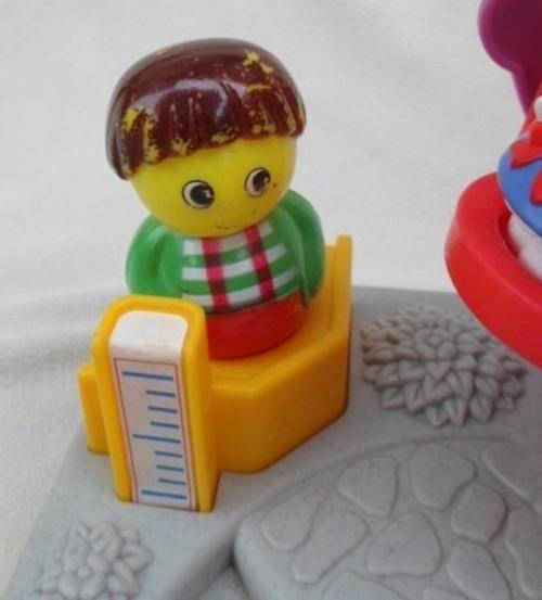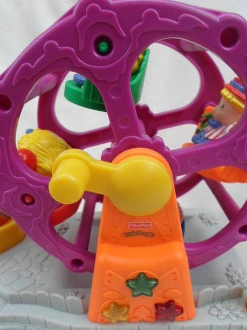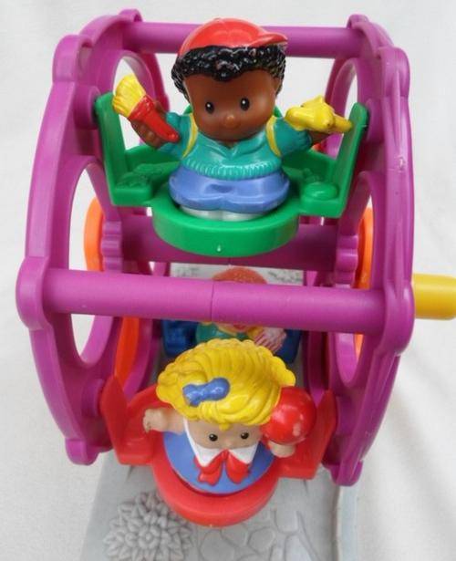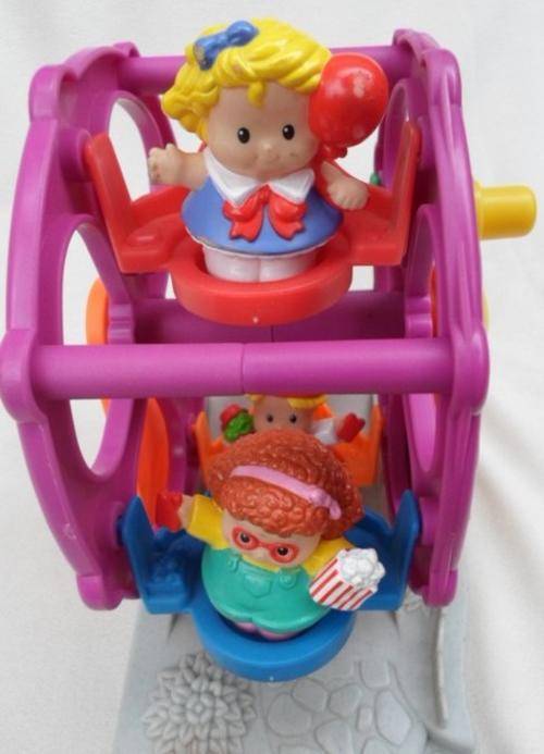 30CM X 21CM X 13CM AND WORKING PERFECTLY. FIVE REMOVEABLE, SHIFTABLE LITTLE PEOPLE INCLUDED SO LOADS OF FUN! TURN BASE SWITCH ON, AND ROTATE THE HANDLE FOR FUN FLASHING LIGHTS AND MUSIC, PRESS THE TICKET OFFICE FOR GIGGLES AND FUN SOUNDS. ENCHANTING! I HAVE LEFT THE ORIGINAL THREE AA BATTERIES IN AND THEY ARE WORKING AT THE MOMENT BUT DON'T KNOW HOW MUCH LIFE IS LEFT IN THEM AND MAY HAVE TO BE REPLACED SOON (OR MAYBE NOT). REFER IMAGES