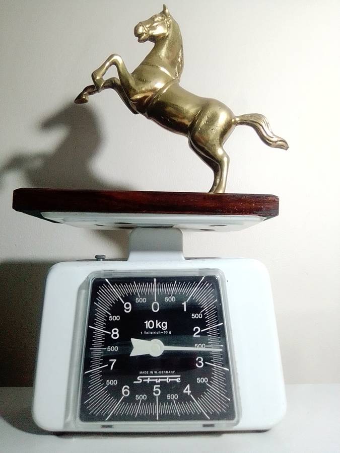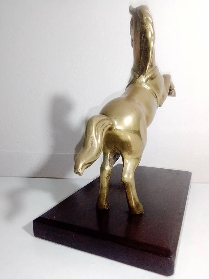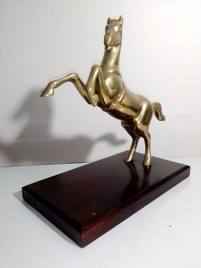 Solid and heavy 2.6Kg Brass Stallion rearing up mounted on a Teak wood stand with green Baze underneath.. Size: 250mm Long x 240mm High x 130mm Wide. a few pit marks under and on side. Sold as good used secondhand condition.