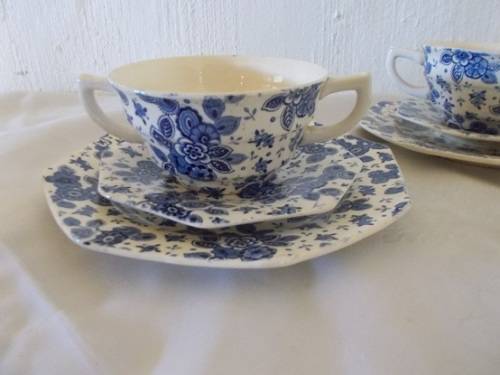 A pair of blue and white floral pattern soup mugs with saucers and side plate set