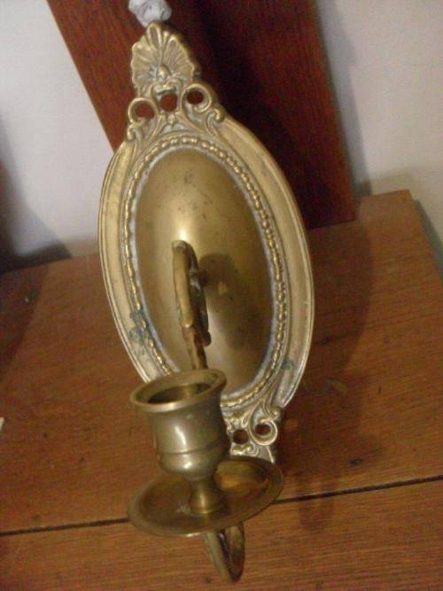 A PAIR OF BRASS WALL MOUNT CANDLE HOLDERS