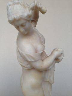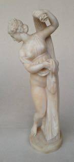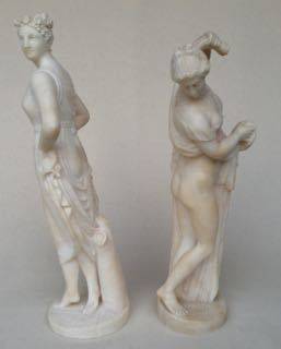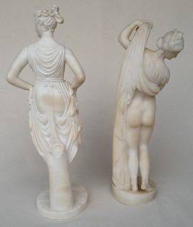 Each modelled in White marble, one disrobing, the other with her hands on her hips, each standing on a circular base, old restorations, the taller is 42cm high.