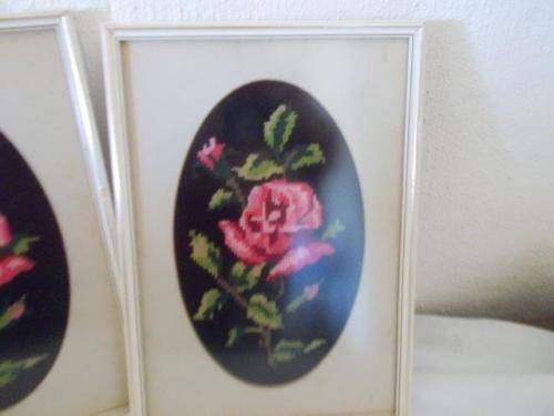 Nice pair of small pink rose flower scene tapestry behind glass items are in good used condition