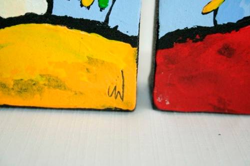 This pair of stunning and very vibrant original signed oil on canvas paintings by Cape Town artist Claire Walker each measure 12cm x 12cm and are in gorgeous condition. The two paintings are perfect for that small space that needs something special, but also as fillers in between larger paintings. Please view the pics carefully to fully appreciate these two gorgeous and very well painted little oil paintings and to confirm the condition.