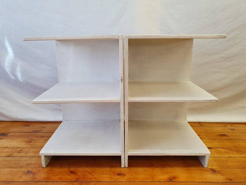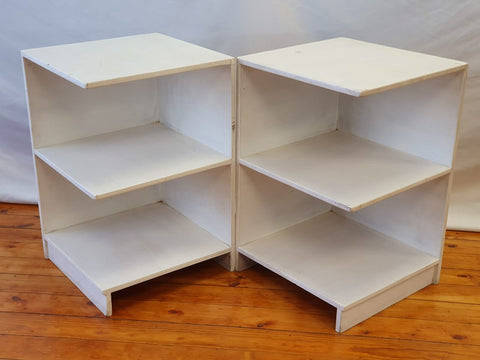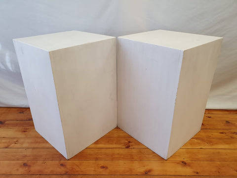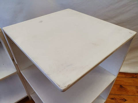 These modern side tables are the ideal tables for indoors or outdoor living areas. The tables measure 44cm x 42cm x 66cm high. The tables are sturdy and sit well on the ground. There is age and usage related wear as shown in the pics. Please view the pics carefully to fully appreciate these occasional/ side tables and to confirm their condition.