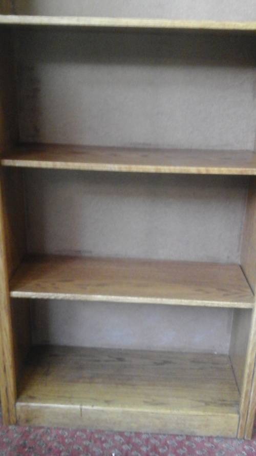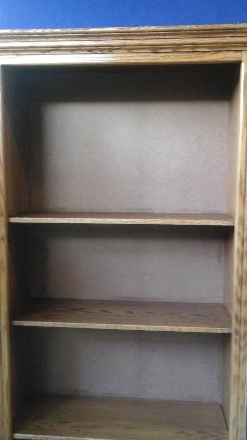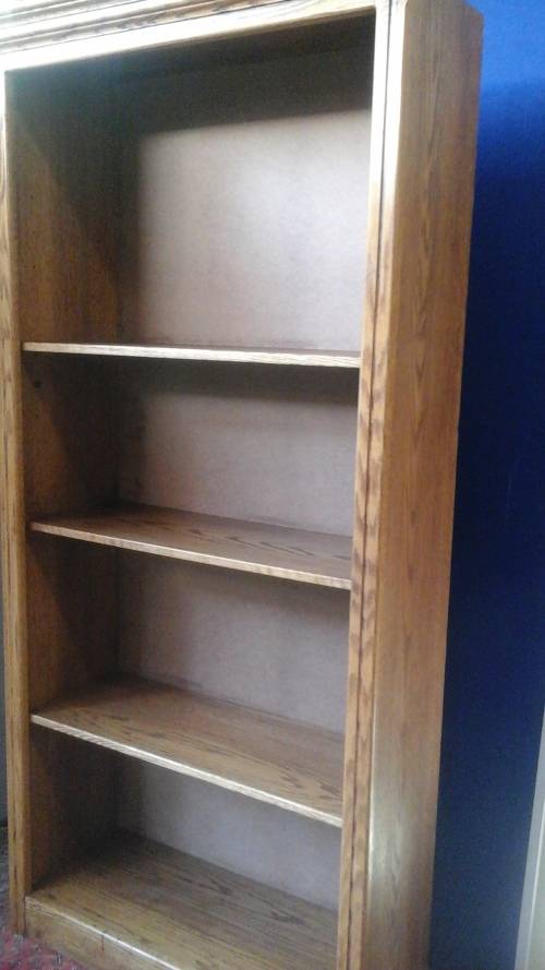 A PHENOMENAL STRONG AND STURDY OAK TYPE BOOK SHELF. LAYERED OUTLINE AND MASONITE BACK