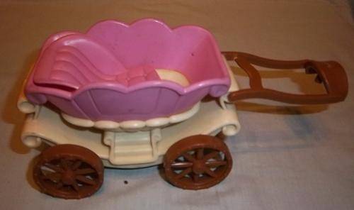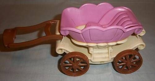 A PLASTIC HORSE COACH FOR DOLLS.  PLAYED WITH BUT FAIR CONDITION.  HORSE RAN AWAY.