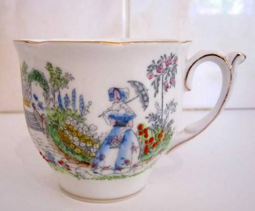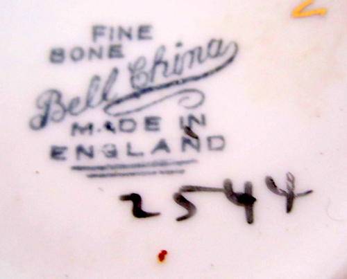 A Pretty Bell china trio. No chips,cracks or grazing. The cup measures 7cm in height. The saucer 13,8cm in diam. and the plate is square 15cm by 15cm.