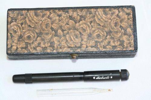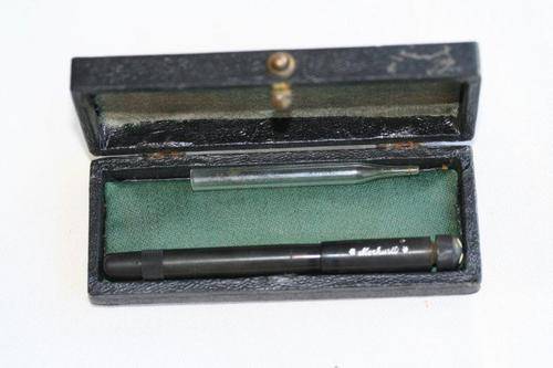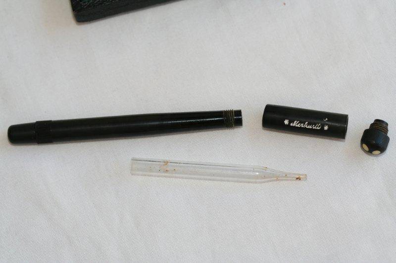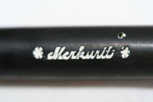 A RARE Merkurit eye dropper fountain pen!!!! This is a rare and unusual Montblanc Lookalike, made by the company Nielsen, working about 8 kilometers away from the Montblanc factory. The pen is an exact copy of a baby safety Montblanc (though threads are different). Instead of a star, there are 3 white Kasein dots inserted into the captop. The length of the pen with the cap closed is 85mm, which is similar to a 00 size babysafety. Unfortunately we do not have any nibs for this particular pen although we have included 3 other very old nibs as part of the deal!!!