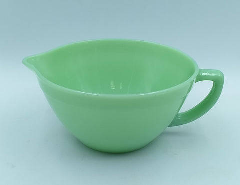 This rare antique (c1950) mid-century USA made Fire King green milk glass (Jadeite) mixing jug is an amazing find and there are only a handful of this beautiful green milk glass mixing jugs in circulation. The mixing jug measures 24.5cm long x 19cm wide x 10cm high and has absolutely no chips or cracks in the glass. The mixing jug is ideal for mixing very hot liquids and the spout makes it easy to pour.