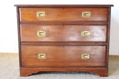 This very rare antique Victorian military style "Campaign Furniture" 3-drawer chest of drawers with brass inlaid handles is an amazing find and most likely dates to between 1800 and 1900 at the height of the expansion of the British Empire into India and Africa. One can still see the brass hinges and clips and although the chest of drawers is now fixed or rigid (does not fold any longer), it would have been made to fold down for travel purposes and would have belonged to a British Officer or Colonist or explorer of that era. The wood looks to be mahogany and the drawers are still in good condition for their age. The chest of drawers measures 107cm long x 49cm wide x 82cm high. Please have a look at the link below for some interesting info on Campaign Furniture. Please view the pics carefully to fully appreciate this remarkable and very rare Victorian Campaign chest of drawers and to confirm the condition. Please view the shipping options or request courier costs prior to purchasing any of our products.