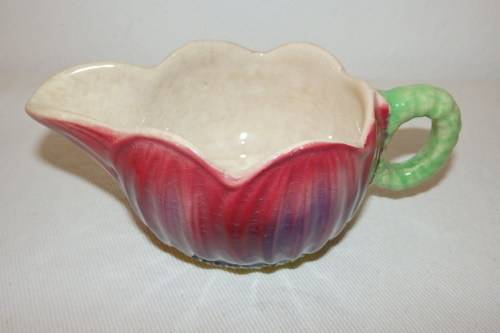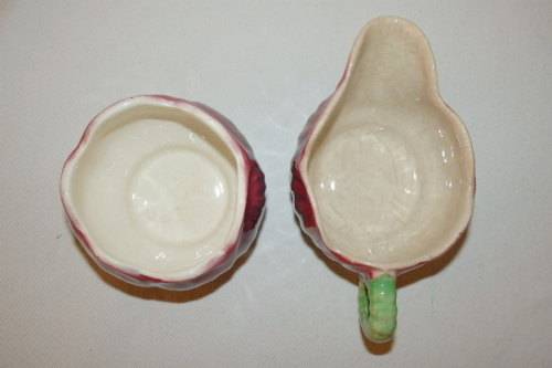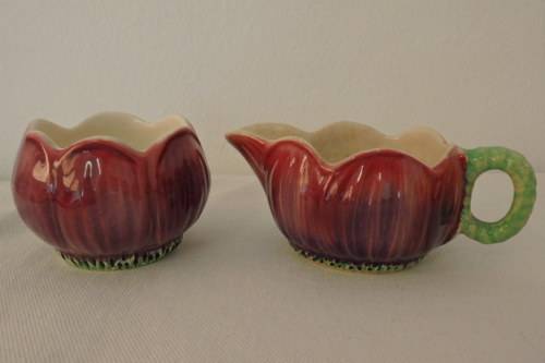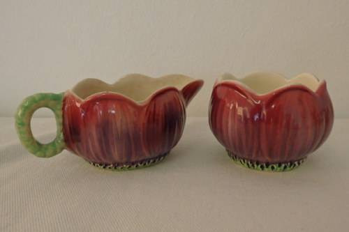 THIS VERY RARE VINTAGE ART DECO ENGLISH MADE "SHORTER & SON" PORCELAIN MILK JUG AND SUGAR BOWL SET IN THE "ANEMONE" RANGE DATES BACK TO AROUND 1935. THE MILK JUG MEASURES 13.5cm LONG (SPOUT TO HANDLE) x 8cm WIDE x 5.5cm HIGH AND THE SUGAR BOWL IS 8.5cm WIDE x 6cm HIGH. THE SET IS IN BEAUTIFUL CONDITION FOR THEIR AGE AND HAVE NO CHIPS OR CRACKS IN THEM. THERE IS A LITTLE CRAZING. EACH OF THE PIECES HAVE BEEN HAND PAINTED IN A RICH RED SET ON IVORY PORCELAIN.