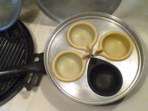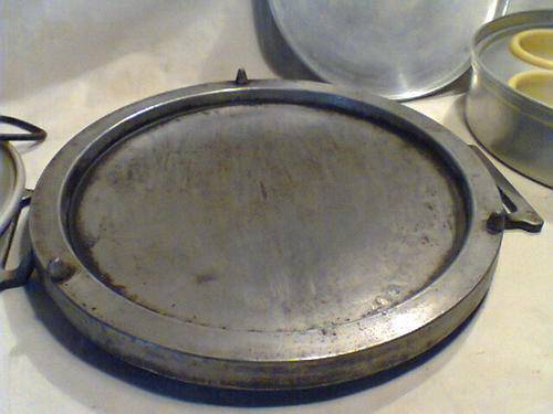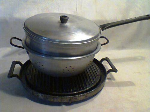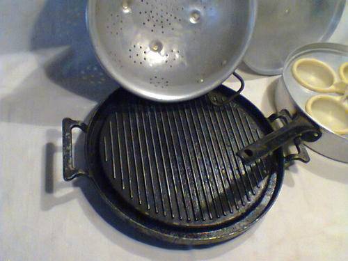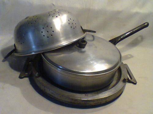 A Real Vintage Collectable Set of Kitchenalia, 3 Alimunum Items Gridel , Colander, Pouch Egg Pot .