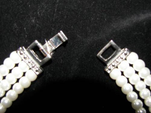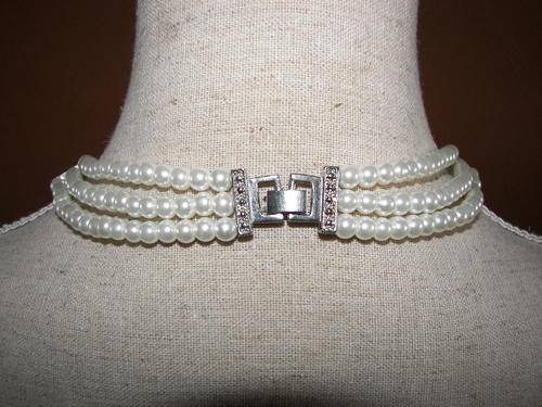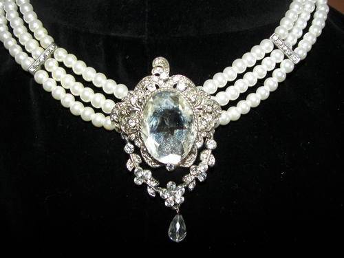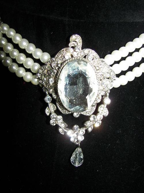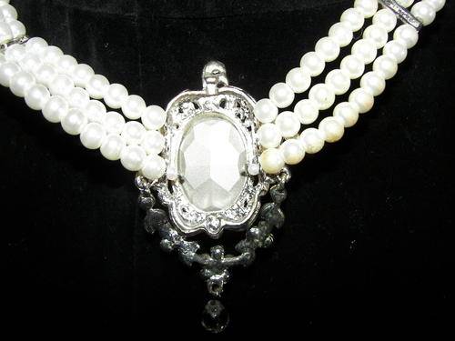 A remarkable piece!Triple Faux pearl choker/silver tone with large ?glass centrepiece pendent