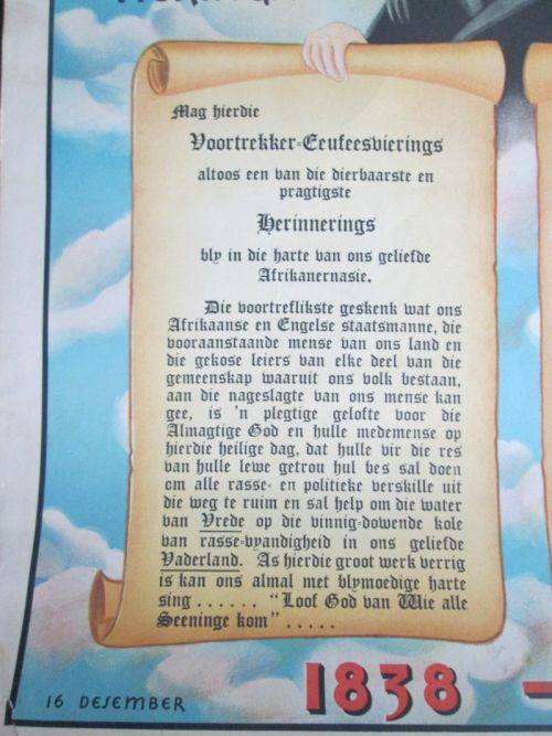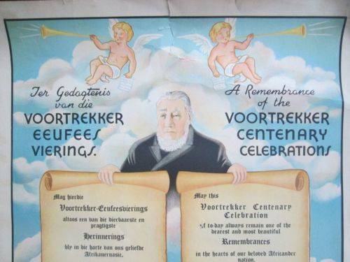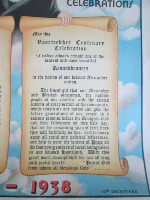 Bi-lingual remembrance printed on thick card, to commemorate the Voortrekker Centenary, 16th December 1938. Size is 430mm x 380mm. Good condition for its age, some tears but no paper loss. Tracked postage tube is R65.00.