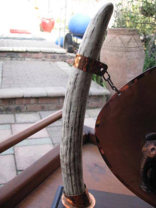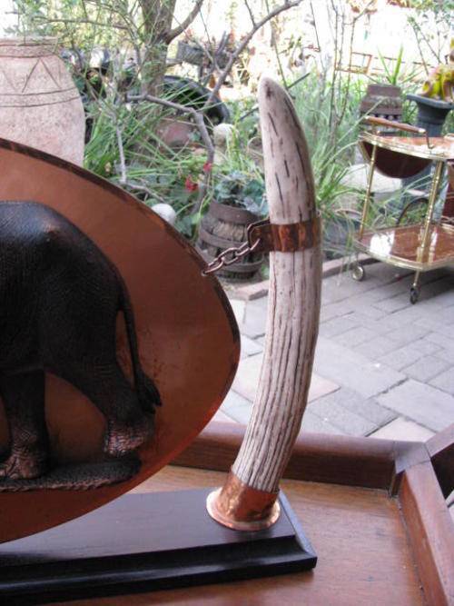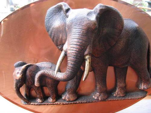 ELEPHANTS ON A COPPER BACKGROUND SUSPENDED BY TUSKS & RESTING ON WOOD BASE