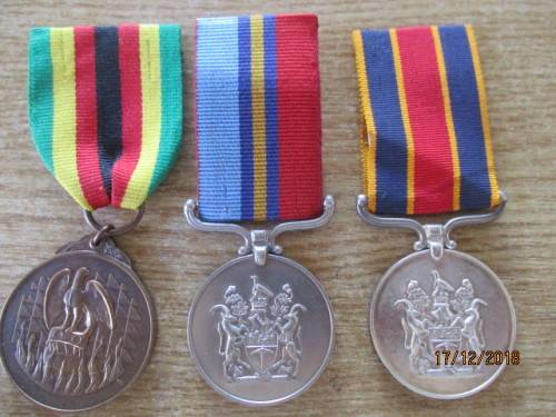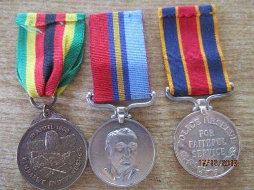A Rhodesian B SA Police Reserve trio -- ZIMBABWE INDEPENDENCE MEDAL 19716, RHODESIAN G S M 7052P F/R ELLMAN--BROWN P.O, POLICE RESERVE LONG SERVICE SILVER MEDAL 7052P F/R P.O. ELLMAN---BROWN. All in excellent condition Please note add local post R 75-00 with tracking no. or Post net R 110-00
