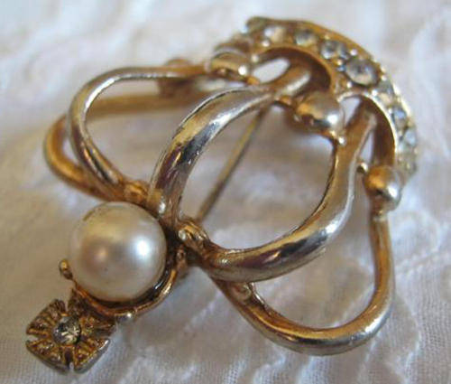 A GILT METAL, ROYAL CROWN BROOCH WITH DIAMANTE AND A FAUX PEARL THAT HAS A LITTLE WEAR. THE BROOCH HAS A ROLL OVER CLASP IN WORKING CONDITION. LENGTH 3.2cm, WIDTH 3.2cm.